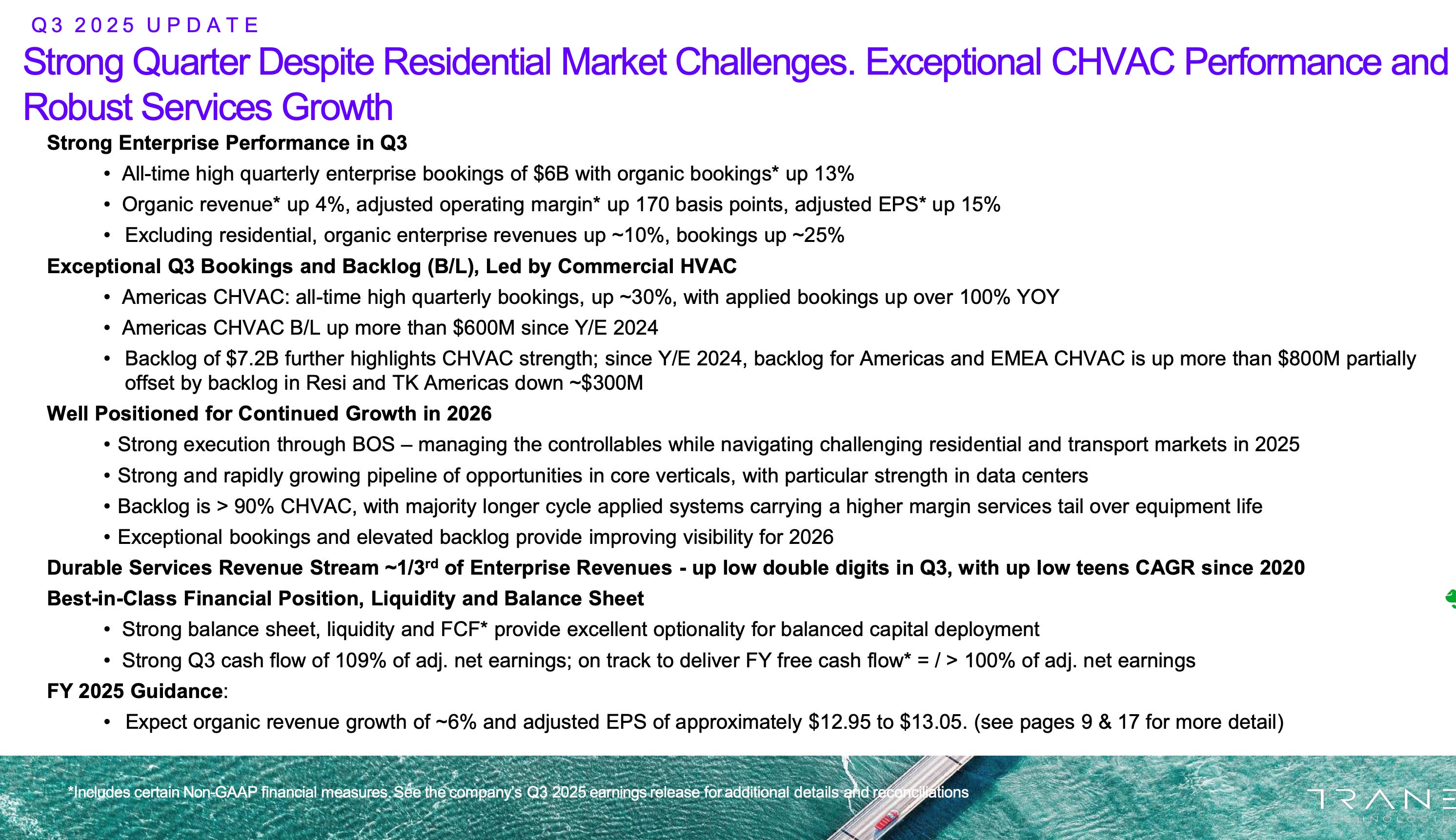 “Record CHVAC bookings / revenues, up ~30% / up low-teens, respectively. Q3 revs up low-teens in equip and up low double digits in services. 3yr stack revs up >50% (applied up >125%)”