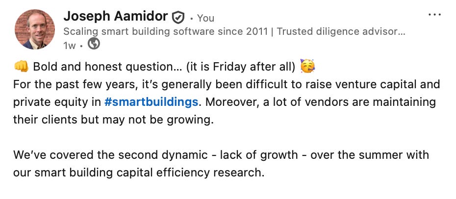 This newsletter is a market wrap up and analysis of the smart buildings industry. If the email was forwarded to you, sign up to receive it directly.