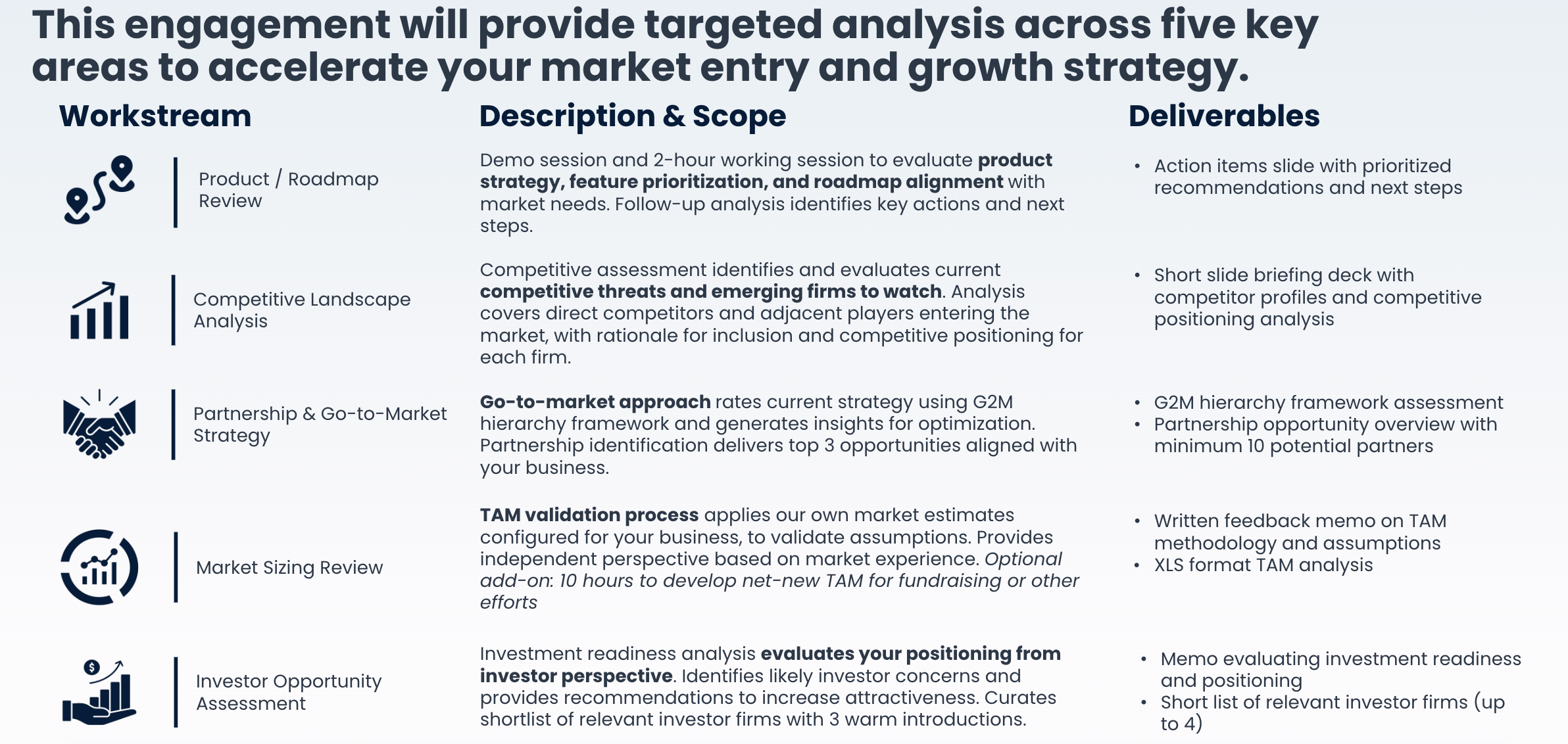 We’re updating our standard offerings for all of our key client types. Below we share some key details on two - our Startup Scale-up offering and our Market Intelligence Subscription (which targets OEM Strategy, Corp Dev and Product teams). Please reach out if either of these are interesting to you.